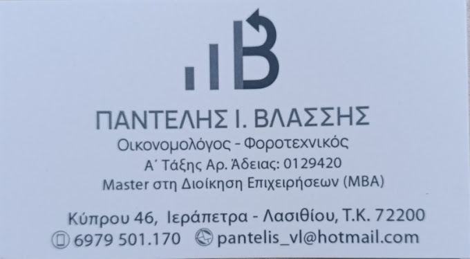 customer tabsΕπικοινωνίαΛογιστικές- Φοροτεχνικές ΥπηρεσίεςΥπηρεσίεςΚύπρου 46, Ιεράπετρα 722 00ΙΕΡΑΠΕΤΡΑ ΛΑΣΙΘΙΟΥΛΑΣΙΘΙΚΡΗΤΗ 6979501170pantelis_vl@hotmail.com Το προτείνω (έχει προταθεί 0 φορές) ΦωτογραφίεςFacebook LikeShare on FacebookTweet Widget