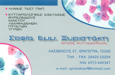 customer tabsΕπικοινωνίαΔέχεται καθημερινά 09:00 -14:00Απόγευμα με ραντεβούΚυτταρολόγοιΥγείαΛασθένους 57, Ιεράπετρα, ΛασίθιΙΕΡΑΠΕΤΡΑ ΛΑΣΙΘΙΟΥΛΑΣΙΘΙΚΡΗΤΗ 2842020204 6973645347xyristakisof@hotmail.com Το προτείνω (έχει προταθεί 0 φορές) ΦωτογραφίεςFacebook LikeShare on FacebookTweet Widget